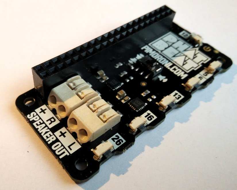 So, if we wanted built-in audio, we would use a Pi 3, as we have an analog audio output. But because we want to make a small project, we need to add audio. There are many different options, for example, Pimoroni has their Phat Beat board and in this project we have chosen to use this board, largely based upon its performance in the test unit we constructed.