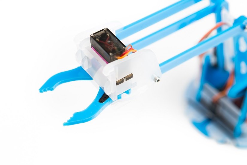 Although the arm worked well enough in general (once we had loosened the base servo horn slightly to ease rotation on the acrylic base), at first we did have a problem with the gripper. Since one of its two interlocking claw pieces kept catching on the small backplate, we removed the latter and found that the grip worked better without it.