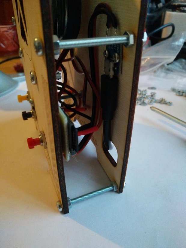 The project has multiple sized holes which are used to insert various sized machine screws used to support the frame, the speaker and to insert three momentary push buttons used to control the playback of audio via the MP3 player.