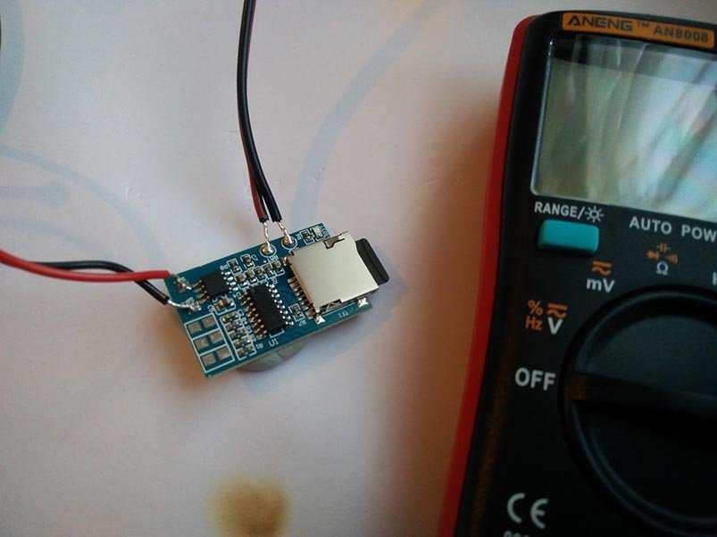 Then I secured the speaker and soldered the wires to the (Red Wire) SP+ and (Black Wire) SP- terminals. Next, I soldered the 5V VCC and GND pins of a micro USB breakout board and connected them to the MP3 player (5V VCC to BAT + and GND to GND)