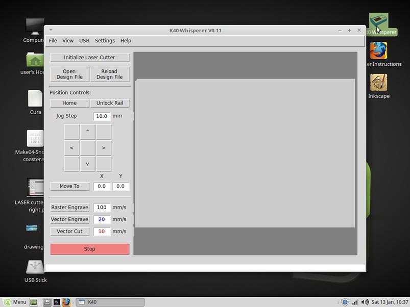 Open the Whisperer application, and then click on Initialize Laser Cutter. This will instruct the K40 to ensure it is in the home position and it confirms there is a connection between devices.