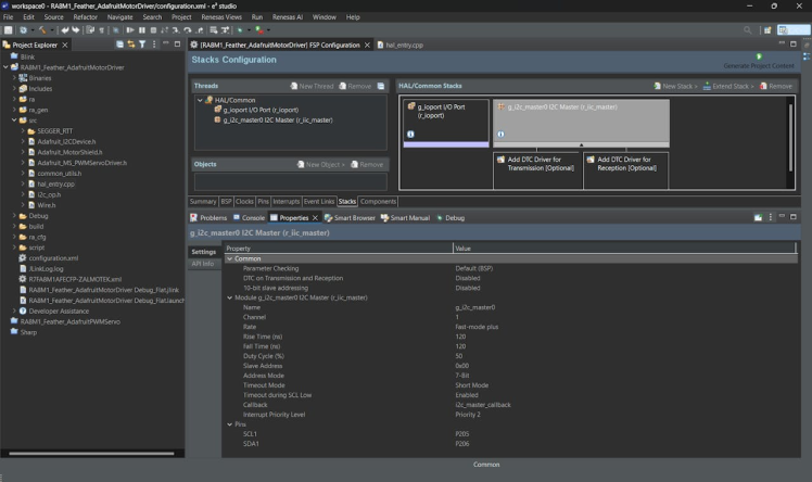 Interfacing with the FeatherWing is done through an I2C connection, with the RA8 Feather SoM acting as the Master. This is reflected in the code by the use of the I2C Master Stack configured to use the available I2C channel, channel 1.