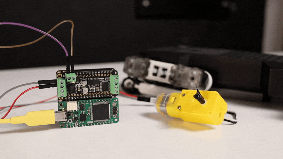 For this example, we will use the Adafruit DC Motor + Stepper FeatherWing which supports up to 4 DC motors or 2 stepper motors. This add-on board is designed to seamlessly stack on top of Feather-compatible boards, including our RA8 Feather SoM.