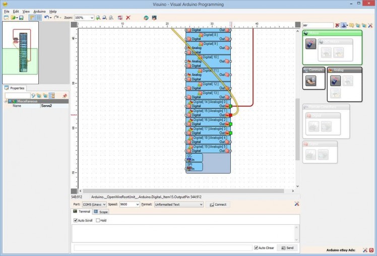 - Connect the "In" pin of the Servo2 component (Picture 3) to the "Out" pin of "Digital[ 15 ]/AnalogIn[ 1 ]" channel of the Arduino component (Picture 4)
