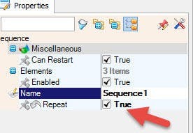 - Select "Sequence1" component and in the properties window set "Repeat" to: True, this will enable to repeat the whole process over and over meaning the lights will continue to flash