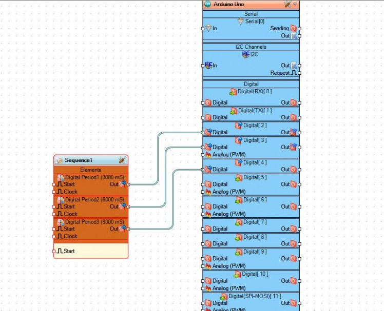 - Connect "Sequence1" > "Digital Period2" pin[Out] to Arduino board digital pin[3]