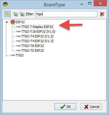 The Visuino: https://www.visuino.eu needs to be installed. Start Visuino as shown in the first picture Click on the "Tools" button on the Arduino component (Picture 1) in Visuino When the dialog appears, select "TTGO T-Display ESP32" as shown on Picture 2