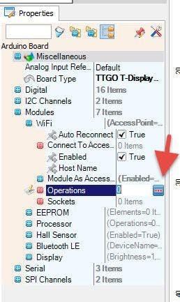 - Select TTGO T-Display ESP32 board and in the properties window expand "Modules" > "WiFi" > "Operations" and click on the 3 dots button