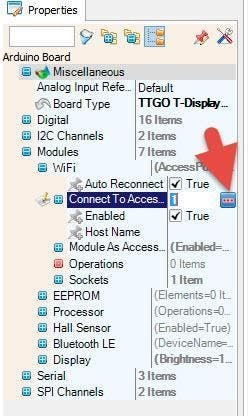 - Select TTGO T-Display ESP32 board and in the properties window expand "Modules>WiFi>Connect To Access Points