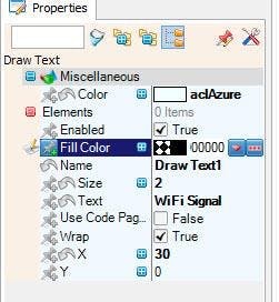 Drag "Draw Text" to the left side and in the properties window set Color to aclAzure, Size to 2, Text to "WiFi Signal", X to 30