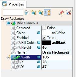 Drag another Drag "Draw Rectangle" to the left side and in the properties window set size to 2, X to 28, Y to 47, height to 45,width to 105, Fill Color to aclBlack
