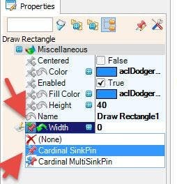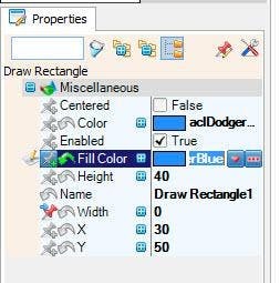 Drag "Draw Rectangle" to the left side and in the properties window set size to 2, X to 30, Y to 60, height to 40, color to aclDodgerBlue, Fill Color to aclDodgerBlue and select width and click on the pin icon and select Float Sink Pin