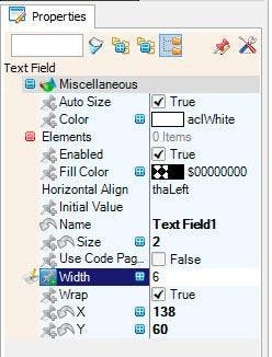 Drag "Text Field" to the left side and in the properties window set size to 2, X to 138, Y to 60