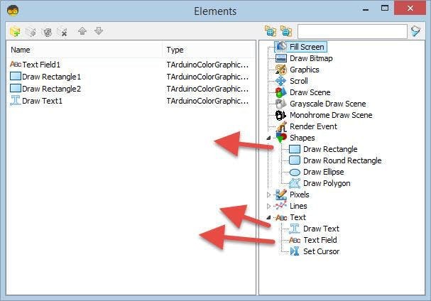 - Select TTGO T-Display ESP32 board and in the properties window expand "Modules>Display>Elements