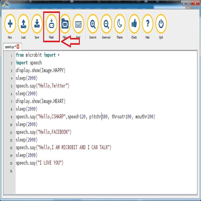 Now, after writing the code, let us see how can we flash it and run our code on Micro:bit. For this, after writing the code, just click on "Flash" button there.