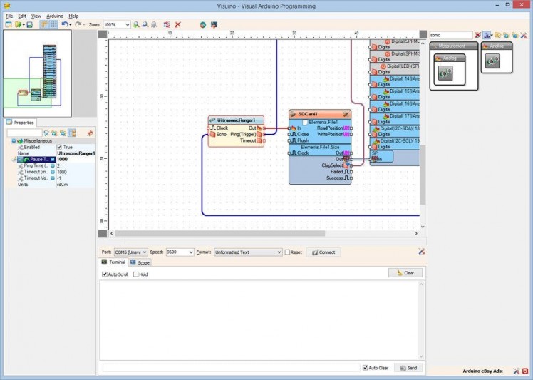 - Connect the "Out" output pin of the UltrasonicRanger1 component to the "In" input pin of the "Elements.File1" of the SDCard1 component (Picture 2)