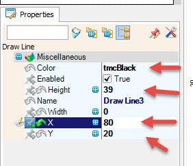 - For "Draw Line3" in the properties window set "Height" to 39 "X" to 80 and "Y" to 20