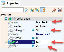 - For "Draw Line2" in the properties window set "Height" to 39 "X" to 60 and "Y" to 20