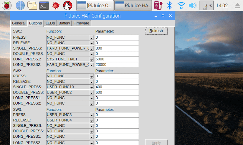The System Task tab includes options to wake up the system upon a certain charge level, battery level or voltage. There’s also a setting for the external watchdog timer: if the PiJuice doesn’t sense a ‘heart beat’ from the software after a certain time, it automatically resets the Raspberry Pi – handy if you can’t physically reach it to a hard reset when it crashes or hangs.