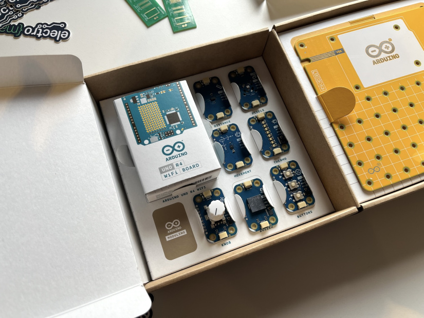 The kit includes seven modular boards: a temperature sensor, distance sensor, buttons, buzzer, knob, pixels, and movement sensor. These modules communicate over I2C and are equipped with quick connectors, making them easy to integrate into your projects. Each module is supported by Arduino libraries, ensuring compatibility and ease of use.