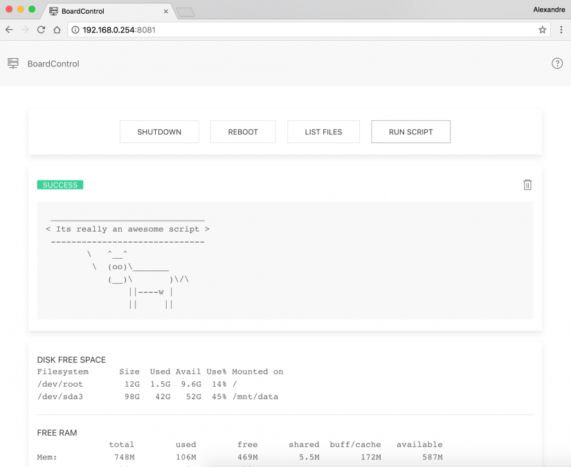 Once installed, Board Control gives simple options to shutdown and reboot, list files, display free disk space (really useful for a board running on a microSD card), or simply run a script.