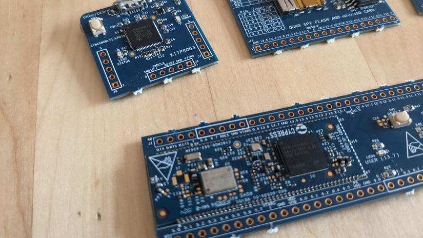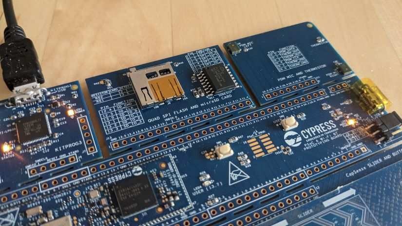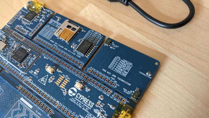 Surrounding the MCU board are various tools to help you work with the 4343w module. On the top left is a KitProg 3 programmer and debugger with a microUSB port. Next to it is a board featuring a microSD card intercave and a 512mb Quad-SPI NOR flash chip.