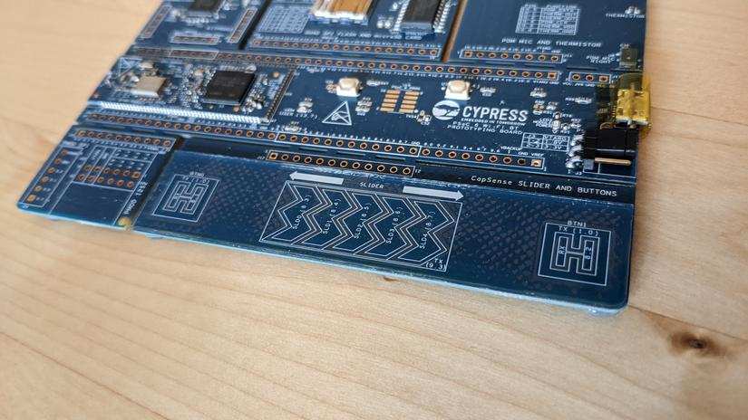 Cypress has included a capacitive sense peripheral at the bottom end of the board, including two buttons and a slider. Rounding everything off is a Digilent Pmod breakout for working with SPI and I2S2 peripherals.
