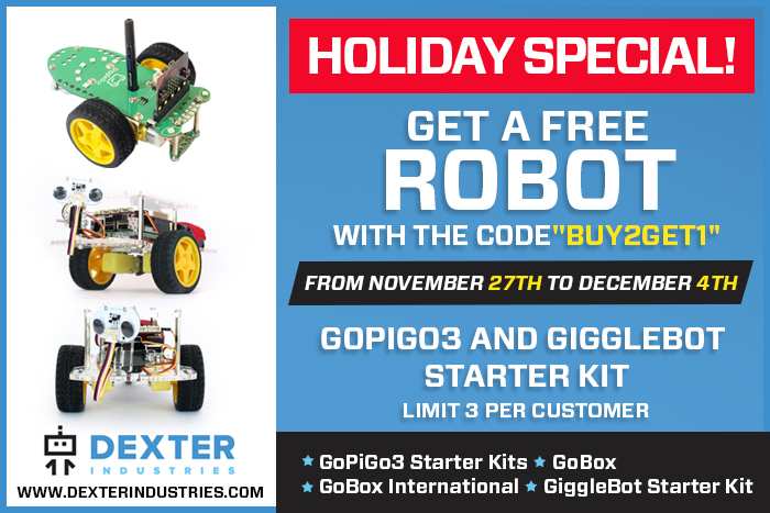 But the deals don't end on Cyber Monday. From November 27 to December 4 there is a sale on robotics starter kits, buy 2 and get 1 free using the code BUY2GET1
