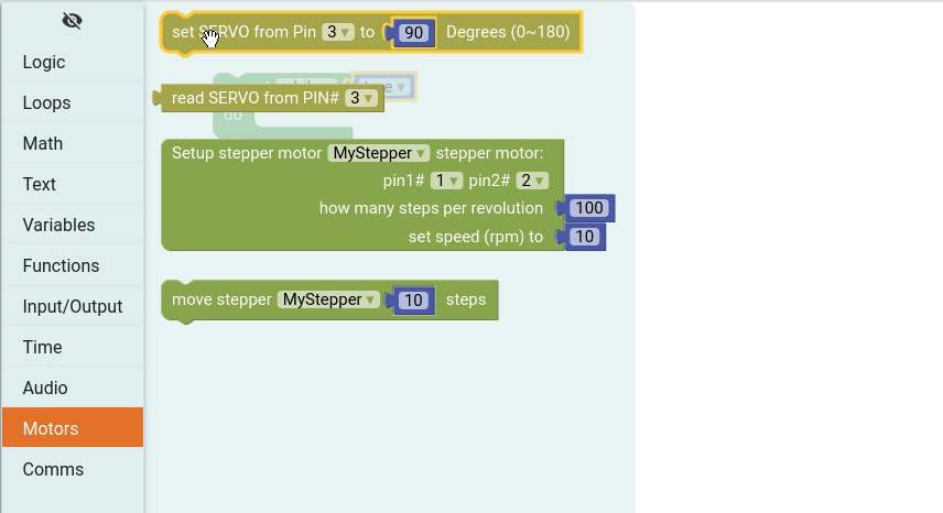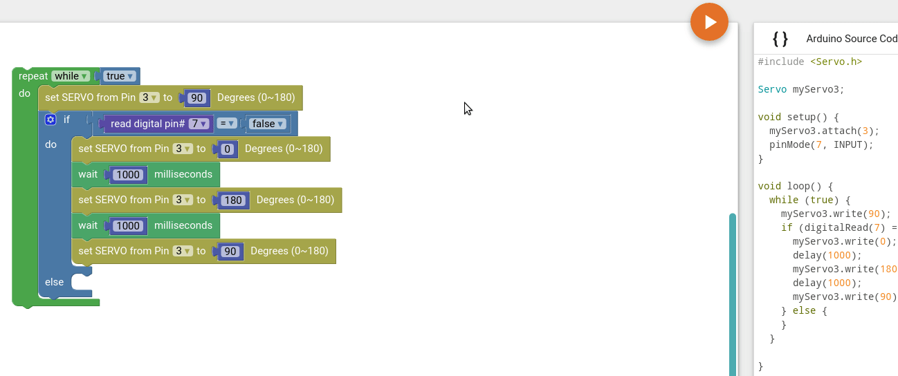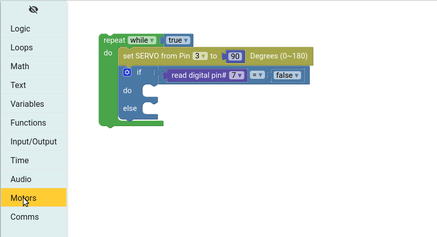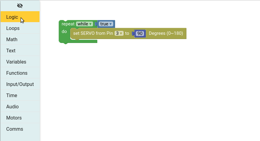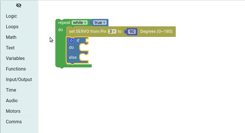 From the Motors group drag the set SERVO from Pin block and place inside the loop. Then change the pin number to 3 and set the rotation to 90.