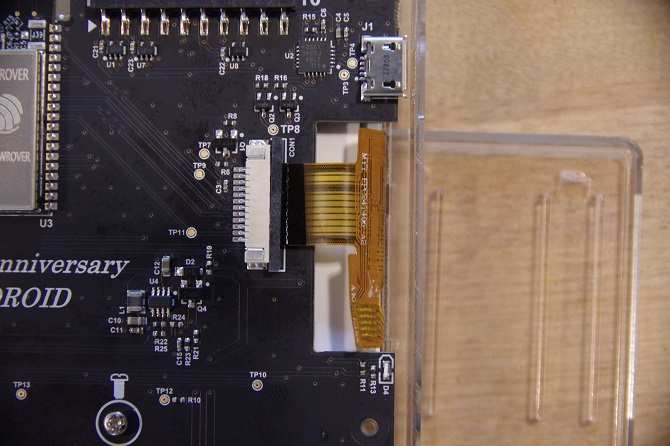 Additionally, attach the LCD screen ribbon cable to the port at the top of the Odroid-Go board. Pull the plastic slider carefully toward the outside edge of the Odroid-Go enclosure. Now, insert the LCD screen ribbon cable. It snugly nestles into place when it's properly inserted. When that's complete, gently move the slider back into position so that it's tight around the ribbon cable.