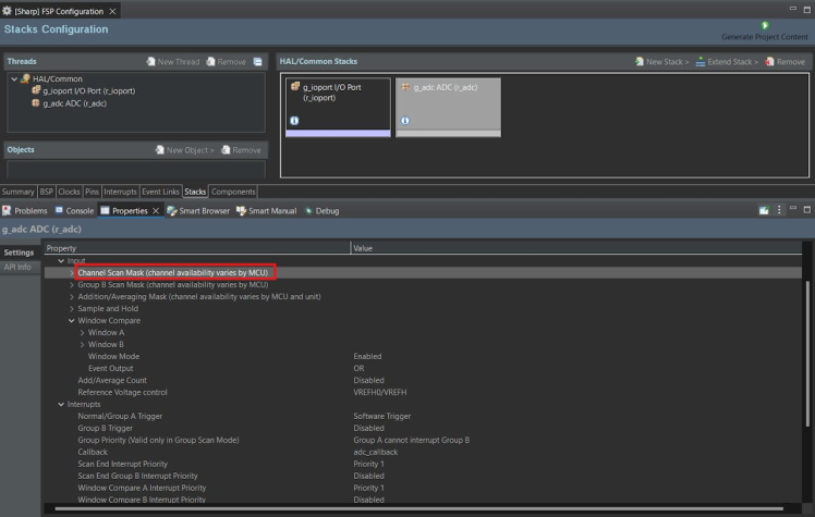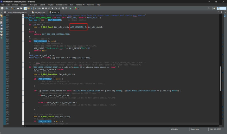 After importing the project into e2 studio, you can customize how the sensor works by changing the mode from Continuous Scan to Single Scan, and selecting the channel you want to scan. To select a specific channel, you need to check its corresponding box from the "Channel Scan Mask" menu and modify the "adc.h" header file to scan the desired channel.