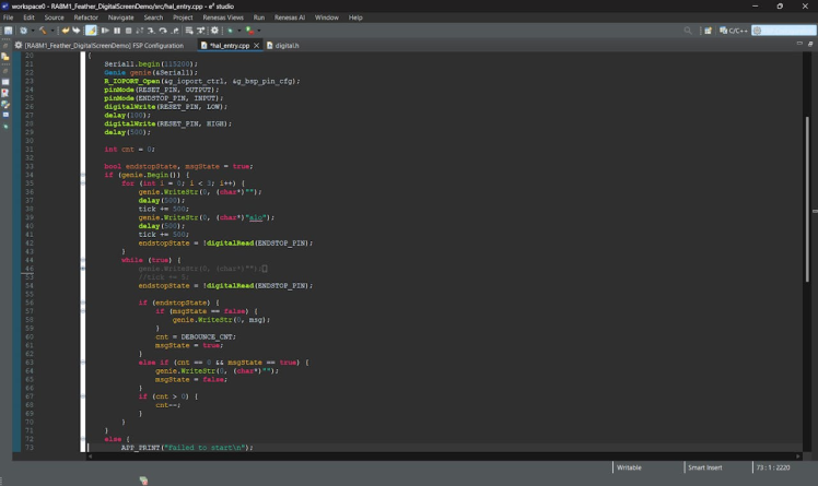 Let's explore a basic example of how to read the state of a limit switch connected to one of the digital pins of the RA8M1 Feather SoM. In the code below, when the switch is pressed, the OBJECT DETECTED message is displayed on the screen.