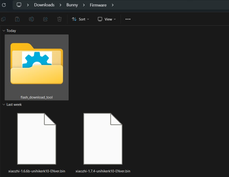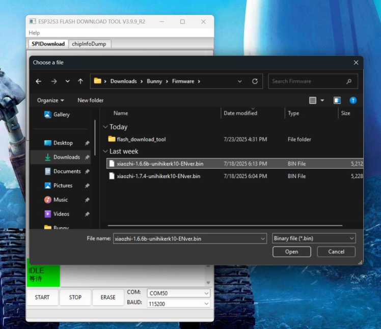 - Get the compiled English xiaozhi firmware.bin file from the AI Bunny GitHub repo.
