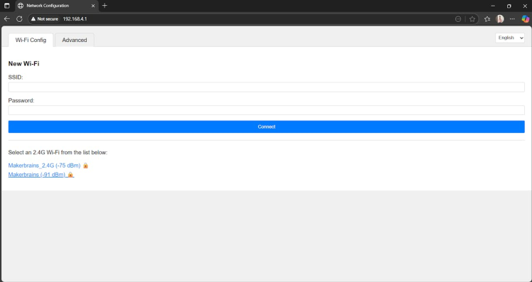 - A configuration page should appear automatically. If not, open a browser and navigate to 192.168.4.1.