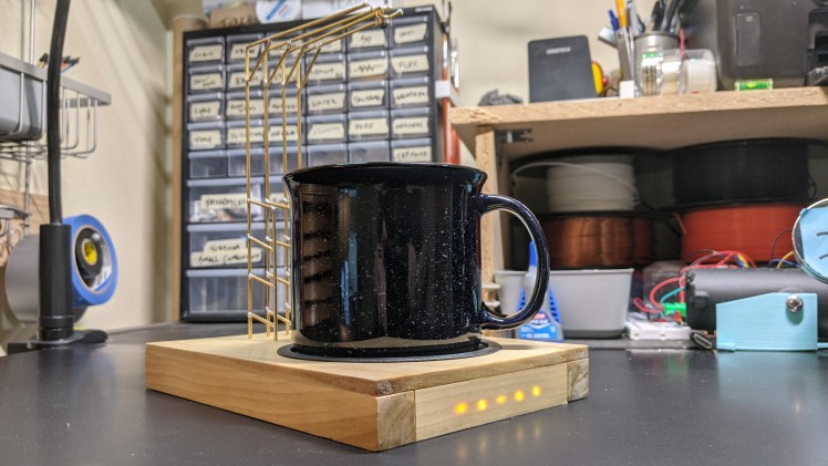 The project consists of a wooden base (poplar, if you’re curious), hiding an Arduino Nano, a battery, and a series of LEDs embedded in the front piece of wood. The Arduino reads temperature data from an Adafruit Melexis infrared sensor that’s supported by a structure built from brass rods, which also acts as the electrical connection between the sensor and the Arduino. There’s a coaster for a mug beneath the switch, in a 3D-printed recess that hides a switch that turns the device on.