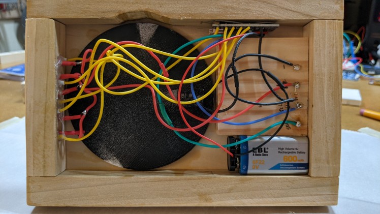 You can now sand the pieces as needed and glue everything together using standard wood glue, and leave clamped to dry overnight (ideally 24 hours). One important note regarding the battery: when you glue in the backing piece you'll want to pinch a 9V battery between the backing piece and one of the sides. This will create a nice press-fit, so you can hold the battery in place without any additional effort (you may need tape if this doesn't work).