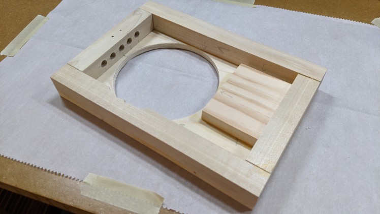This is achieved by drilling five holes in the back of the front piece of wood, as close to all the way through as possible without actually finishing the hole. I'd recommend doing this with a drill press, although I did it by hand. Don't be discouraged if you accidentally drill too far! I made a second one of these devices as a gift and had to start over on this step three different times before I got it right.