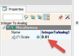 - Set the Frequency increments: Select "IntegerToAnalog1" and in the properties window set "Scale" in our case it is 0.01