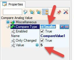 - Set the End Frequency: Select "CompareValue1" and in the properties window set "Value" in our case it is 5Hz and set "Compare Type" to ctSmaller