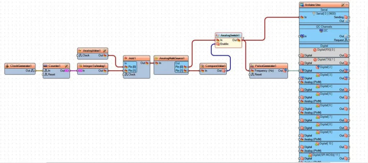 - Connect "AnalogSwitch1" pin [Out] to "PulseGenerator1" pin[Frequency]