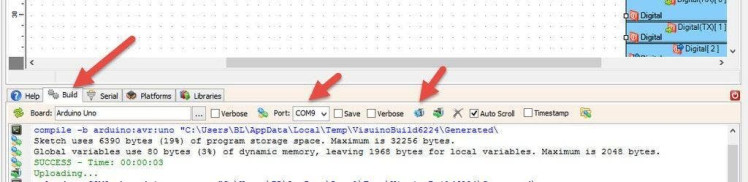 In Visuino, at the bottom click on the "Build" Tab, make sure the correct port is selected, then click on the "Compile/Build and Upload" button.