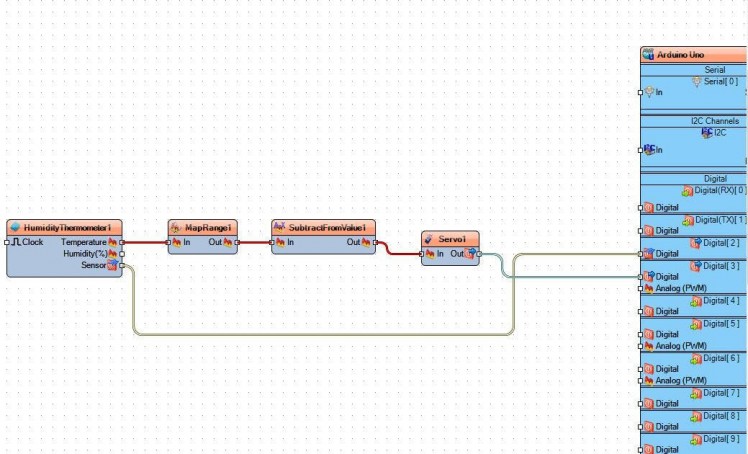 - Connect "HumidityThermometer1" pin [Temperature] to "MapRange1"pin[In]