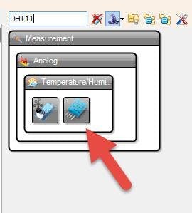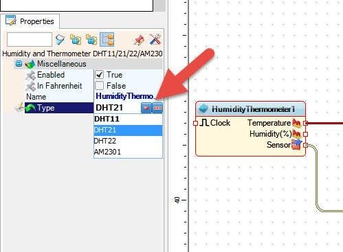 If you select "HumidityThermometer1" component you can select diferent DHT type sensors in the properties window (see the picture).