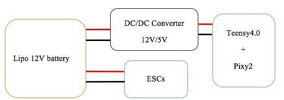 The Teensy4.0 programming board works in 5V while the motors operate in a voltage range from 7V to 12V. To adapt this voltage difference we decided to use a DC/DC converter from 12V to 5V. We could then power the motors and the programming board with the same battery.
