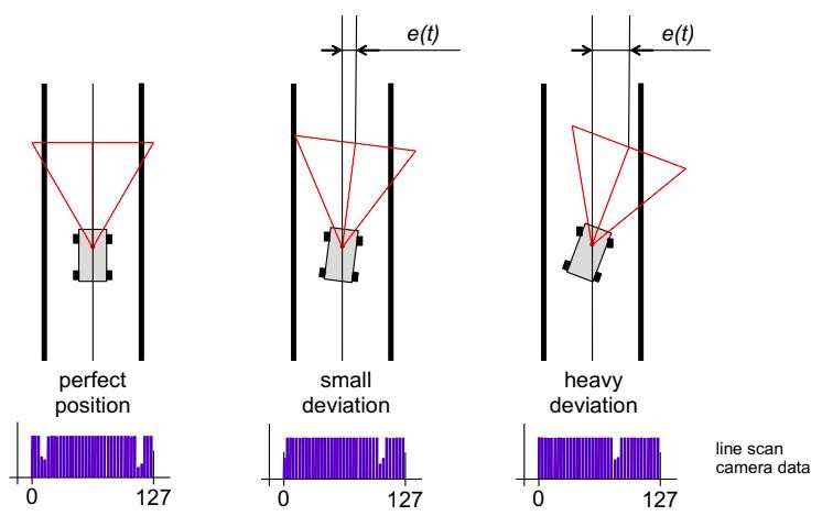 - The Parallax TSL1401 linear camera is a 1D camera that allows viewing over a larger width (often 128 pixels). It returns an intensity value per pixel, that is, it differentiates the contrast between a black line and a white background. Thus, we will correct the trajectory error of the car according to the return of the linear camera as below.