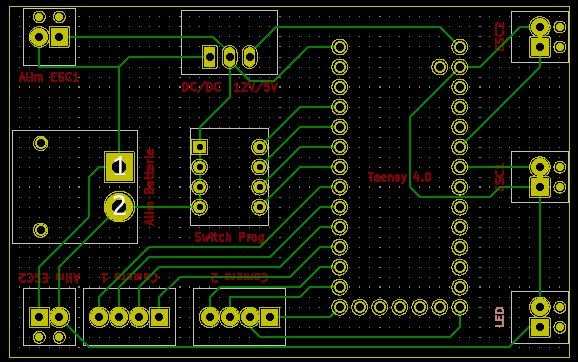 To industrialize our system, we designed a printed circuit board composed of the DC/DC converter, the Teensy4.0 board, buttons and terminal blocks. The terminal blocks allow us to wiring different signals and motors. The buttons that have been added will be very useful to the structure of the program, so we can activate the features of our car like different speed regimes or the use of one or both cameras. Then, we created a clean and disconnectable system, which makes it easier to change parts or solve problems.