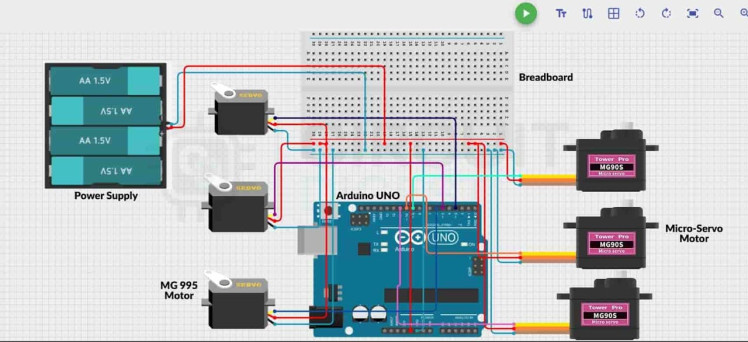 💻 Arduino Code & LogicThe core logic for this robotic arm is written in the Arduino IDE using the Servo library. At startup, each servo initializes to a safe 90° neutral angle, reducing mechanical stress and preparing the arm for controlled motion.