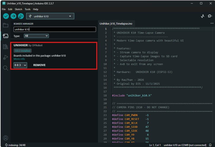 Once the board is installed and selected, the Arduino IDE is ready to upload code to the UNIHIKER K10.