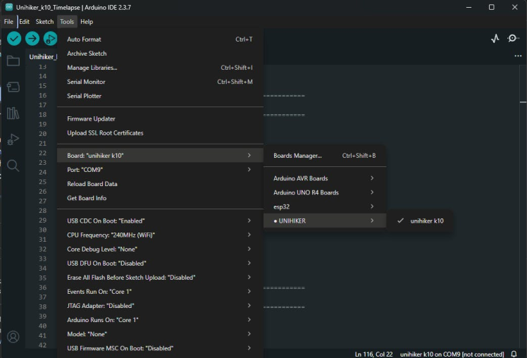 After the installation is complete, go to Tools → Board and select Unihiker K10 from the list.
