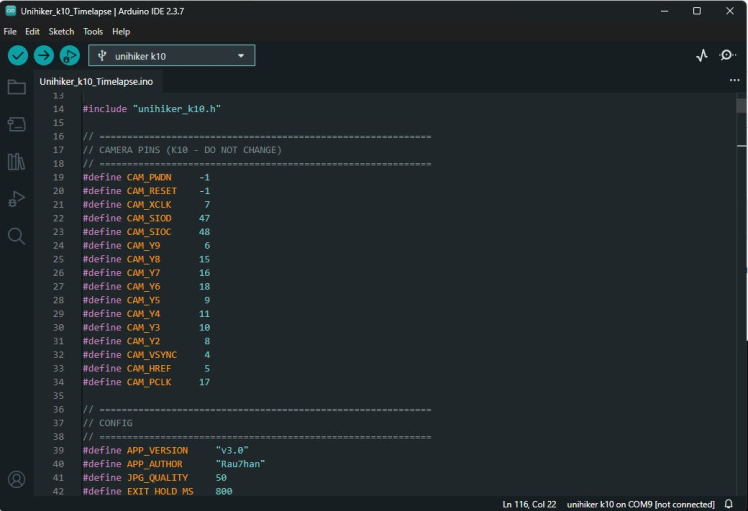 In this step, we upload the firmware that controls the timelapse camera. The code provides a simple on-screen menu to select camera mode, resolution, and capture interval. It also handles image capture, file naming, and saving photos to the microSD card automatically.
